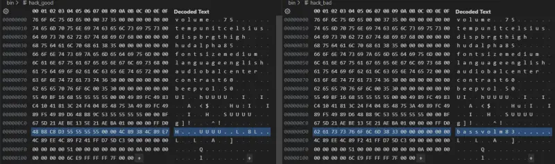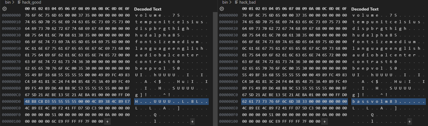 Here you can see the intact payload and the version overridden by a “bass volume” setting: