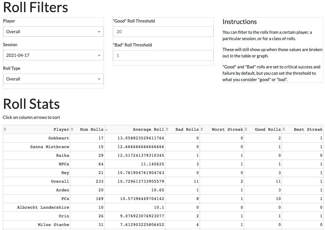 Unsurprisingly, I am a member of a DnD (Pathfinder actually) group. During the pandemic we switch to playing online with a service called Roll20. We would often joke about the software using weighted dice, so I had the idea to analyze the data and see who’s the unluckiest.